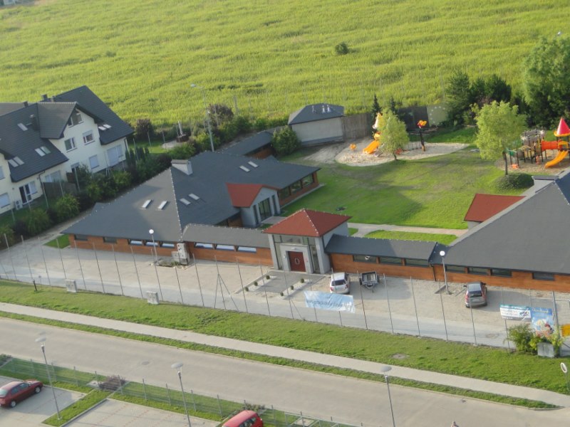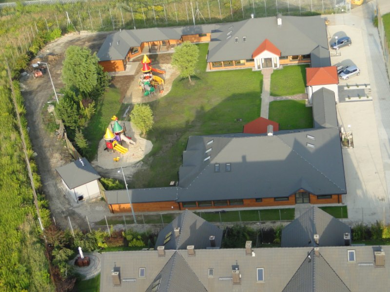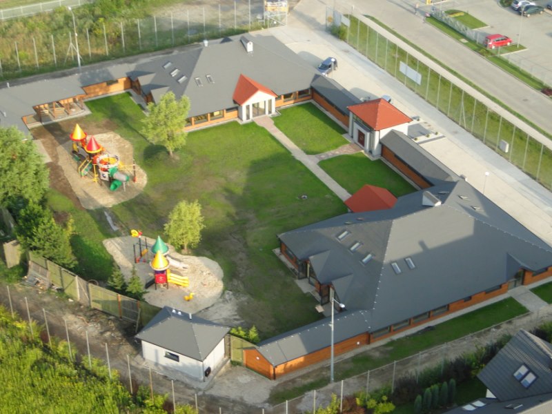 Przebudowa obiektu produkcji filmowej i telewizyjnej na obiekt przedszkolny. Budynek o konstrukcji drewnianej wymagał przebudowy pomieszczeń, a w tym głównych elementów konstrukcji, wykonania głównego wejścia, docieplenia ścian osłonowych, wykonania posadzek z ociepleniem. Prace przy konstrukcji drewnianej wymagały wykazania się nietuzinkowym kunsztem ciesielskim, tak obecnie mało praktykowanym. Obiekt wymagał wykonania wszelkich prac branżowych i wykończeniowych z przystosowaniem do użytkowania przez przedszkolaków, np. sanitariaty czy wielobarwna kolorystyka.